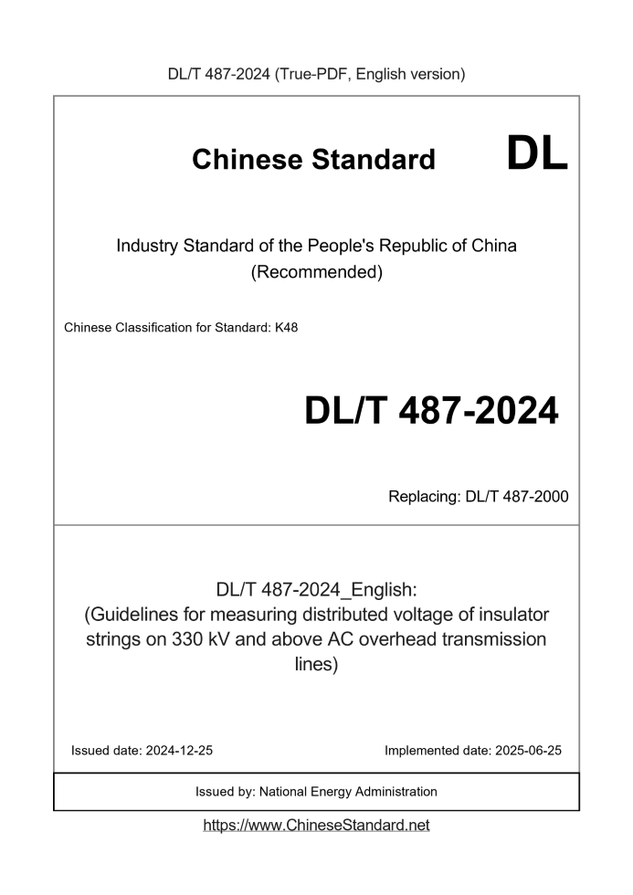 | DL/T 487-2024 | English | RFQ | ASK | 3 days [Need to translate] | (Guidelines for measuring distributed voltage of insulator strings on 330 kV and above AC overhead transmission lines) |