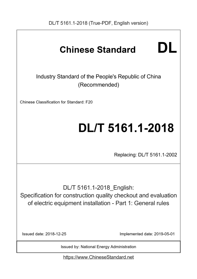 Delivery: <= 9 days. True-PDF full-copy in English will be manually translated and delivered via email. DL/T 5161.1-2018: Specification for construction quality checkout and evaluation of electric equipment installation - Part 1: General rules Status: Valid DL/T 5161.1: Historical versions