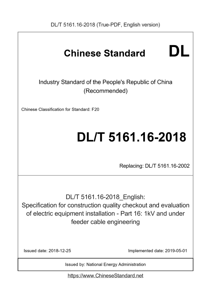 Delivery: <= 3 days. True-PDF full-copy in English will be manually translated and delivered via email. DL/T 5161.16-2018: Specification for construction quality checkout and evaluation of electric equipment installation - Part 16: 1kV and under feeder cable engineering Status: Valid DL/T 5161.16: Historical versions