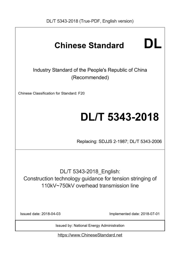 Delivery: <= 9 days. True-PDF full-copy in English will be manually translated and delivered via email. DL/T 5343-2018: Construction technology guidance for tension stringing of 110kV~750kV overhead transmission line Status: Valid DL/T 5343: Historical versions