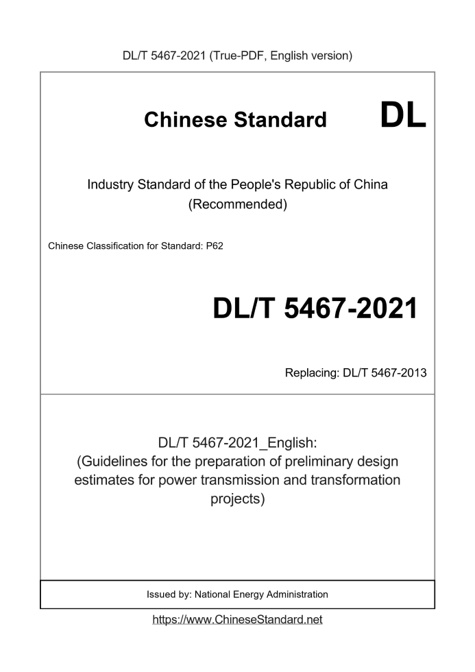 Delivery: <= 8 days. True-PDF full-copy in English will be manually translated and delivered via email. DL/T 5467-2021: (Guidelines for the preparation of preliminary design estimates for power transmission and transformation projects) Status: Valid DL/T 5467: Historical versions