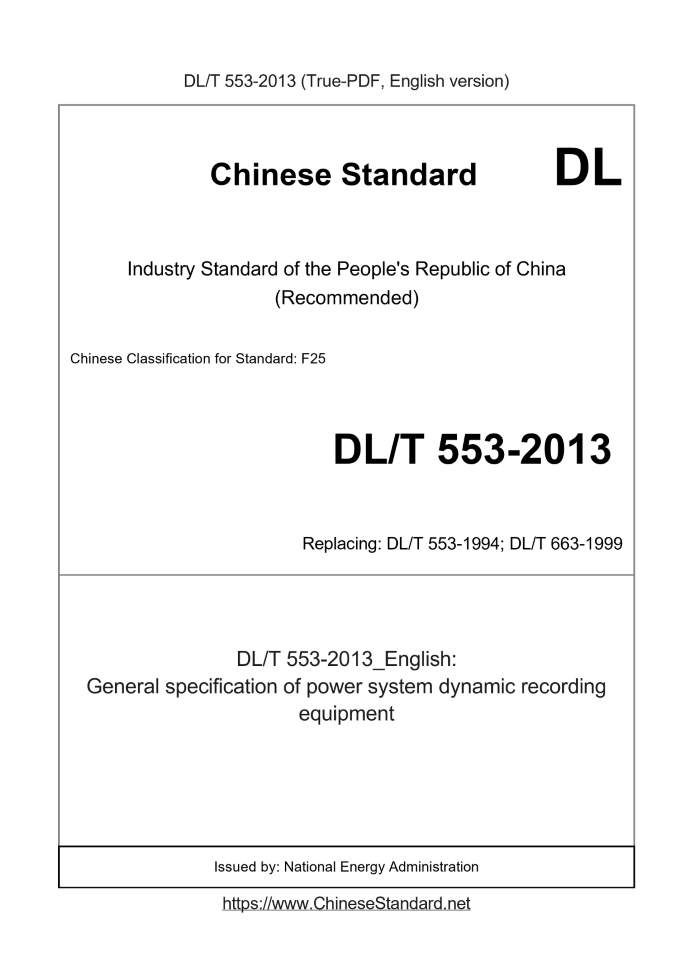 Delivery: <= 6 days. True-PDF full-copy in English will be manually translated and delivered via email. DL/T 553-2013: General specification of power system dynamic recording equipment Status: Valid DL/T 553: Historical versions