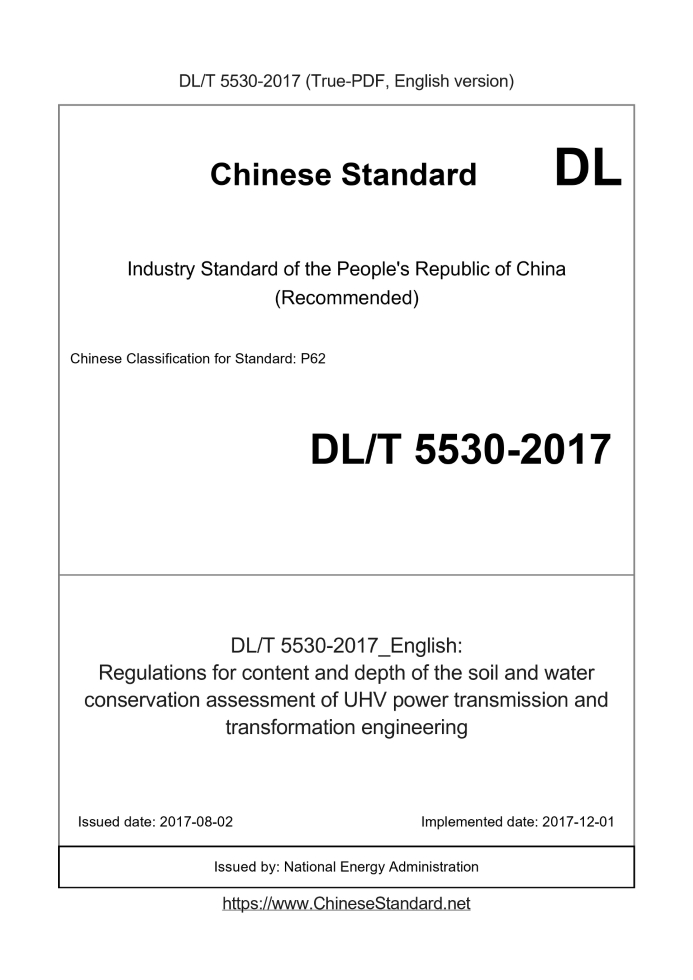 Delivery: <= 9 days. True-PDF full-copy in English will be manually translated and delivered via email. DL/T 5530-2017: Regulations for content and depth of the soil and water conservation assessment of UHV power transmission and transformation engineering Status: Valid