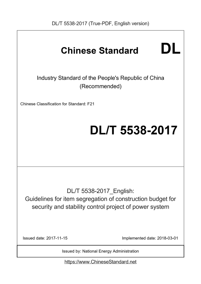Delivery: <= 4 days. True-PDF full-copy in English will be manually translated and delivered via email. DL/T 5538-2017: Guidelines for item segregation of construction budget for security and stability control project of power system Status: Valid