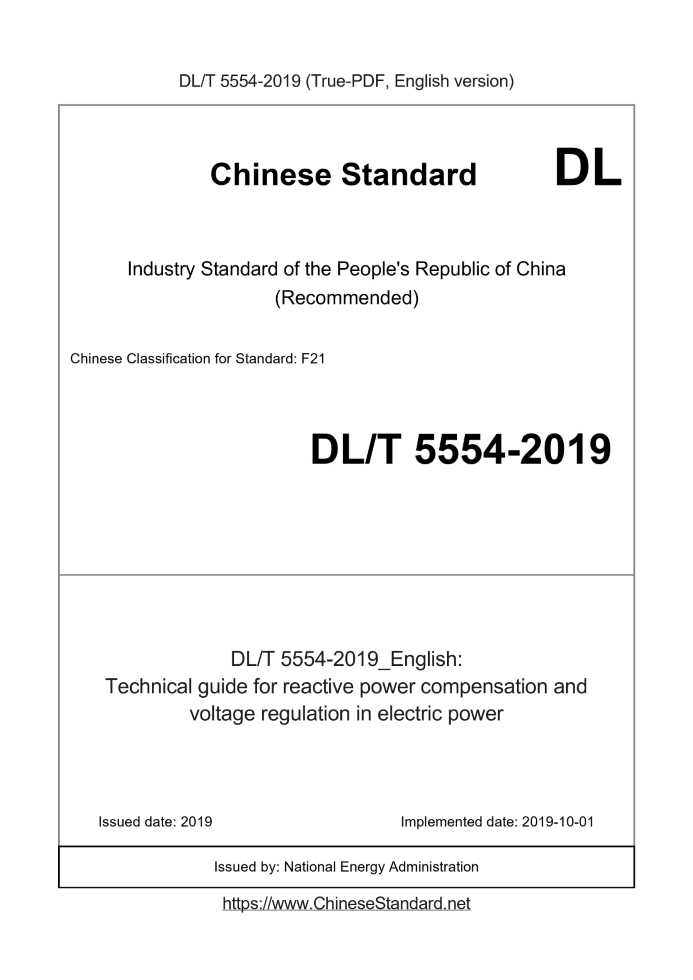 Delivery: <= 6 days. True-PDF full-copy in English will be manually translated and delivered via email. DL/T 5554-2019: Technical guide for reactive power compensation and voltage regulation in electric power Status: Valid