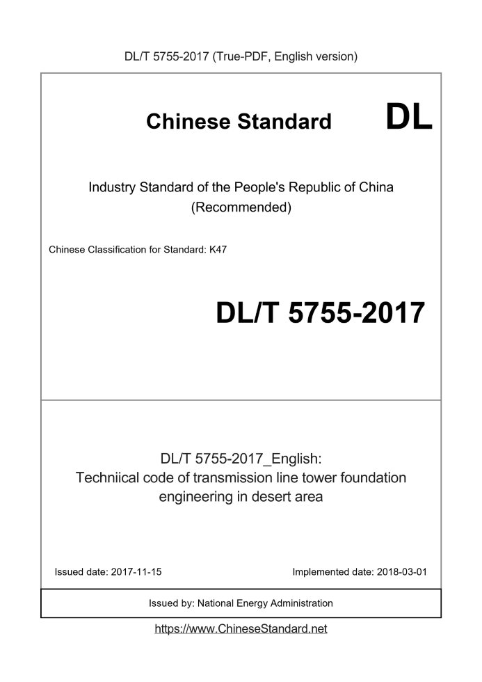 Delivery: <= 10 days. True-PDF full-copy in English will be manually translated and delivered via email. DL/T 5755-2017: Techniical code of transmission line tower foundation engineering in desert area Status: Valid