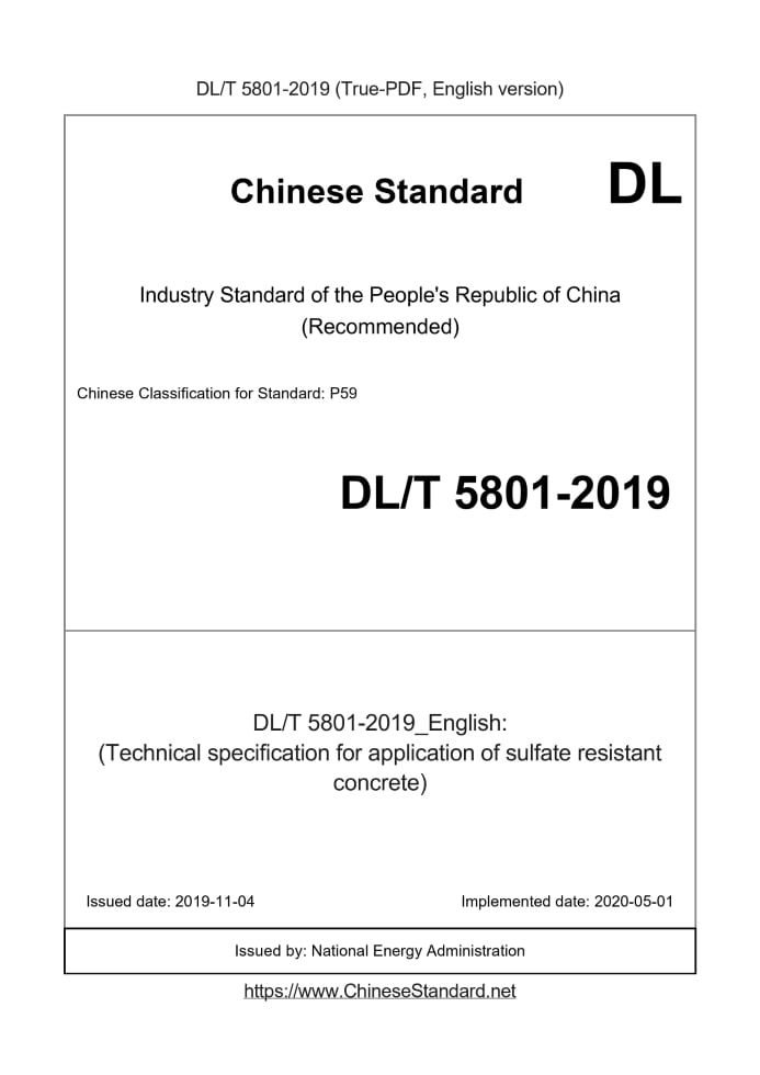 Delivery: <= 6 days. True-PDF full-copy in English will be manually translated and delivered via email. DL/T 5801-2019: (Technical specification for application of sulfate resistant concrete) Status: Valid