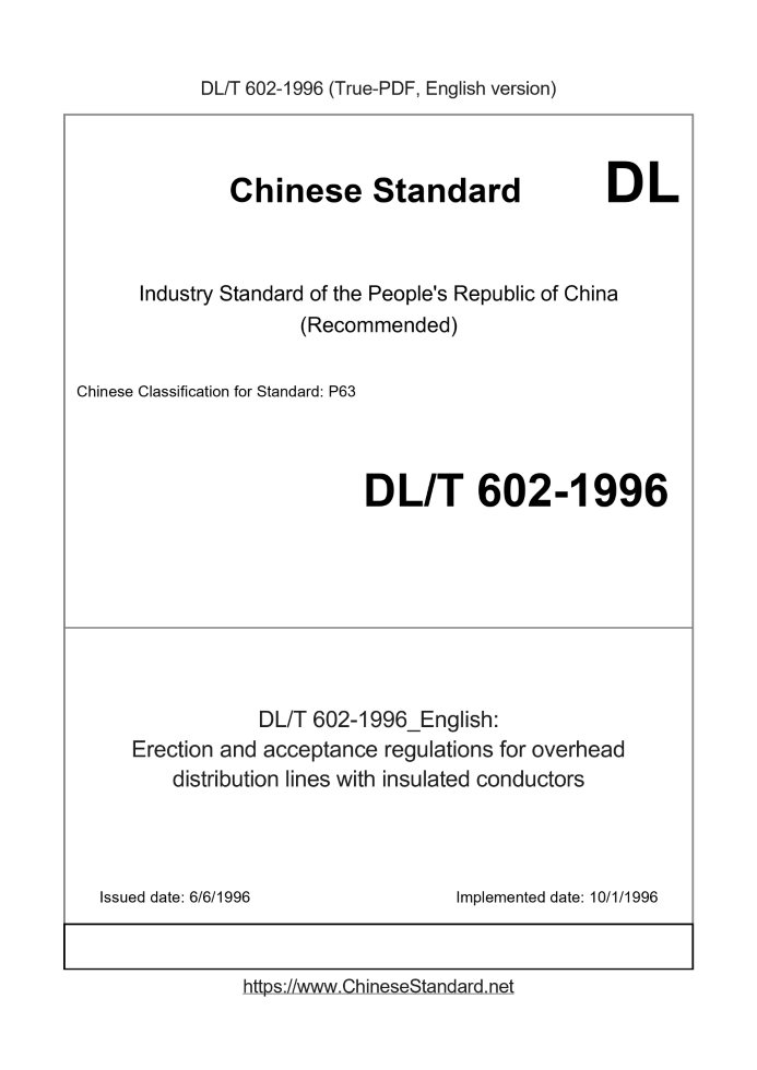 Delivery: <= 5 days. True-PDF full-copy in English will be manually translated and delivered via email. DL/T 602-1996: Erection and acceptance regulations for overhead distribution lines with insulated conductors