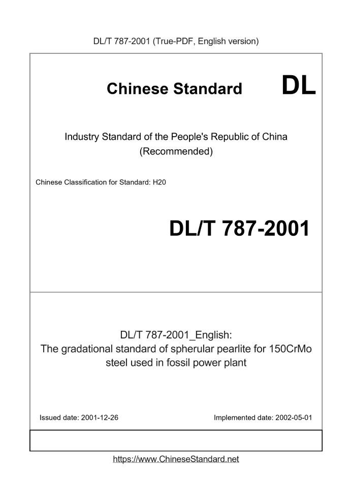 Delivery: <= 3 days. True-PDF full-copy in English will be manually translated and delivered via email. DL/T 787-2001: The gradational standard of spherular pearlite for 150CrMo steel used in fossil power plant Status: Valid
