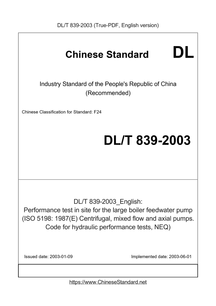 Delivery: <= 6 days. True-PDF full-copy in English will be manually translated and delivered via email. DL/T 839-2003: Performance test in site for the large boiler feedwater pump (ISO 5198: 1987(E) Centrifugal, mixed flow and axial pumps. Code for hydraulic performance tests, NEQ) Status: Valid