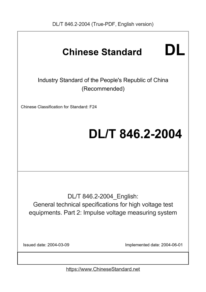 Delivery: <= 4 days. True-PDF full-copy in English will be manually translated and delivered via email. DL/T 846.2-2004: General technical specifications for high voltage test equipments. Part 2: Impulse voltage measuring system Status: Valid