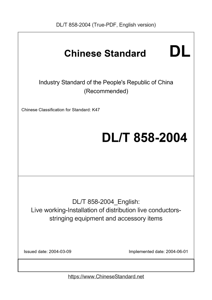Delivery: <= 5 days. True-PDF full-copy in English will be manually translated and delivered via email. DL/T 858-2004: Live working-Installation of distribution live conductors-stringing equipment and accessory items Status: Valid