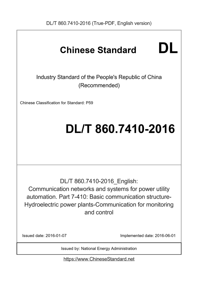 Delivery: <= 3 days. True-PDF full-copy in English will be manually translated and delivered via email. DL/T 860.7410-2016: Communication networks and systems for power utility automation. Part 7-410: Basic communication structure-Hydroelectric power plants-Communication for monitoring and control Status: Valid