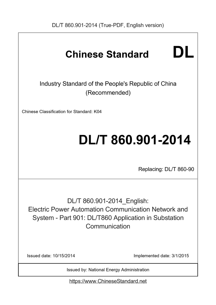 Delivery: <= 10 days. True-PDF full-copy in English will be manually translated and delivered via email. DL/T 860.901-2014: Electric Power Automation Communication Network and System - Part 901: DL/T860 Application in Substation Communication Status: Valid