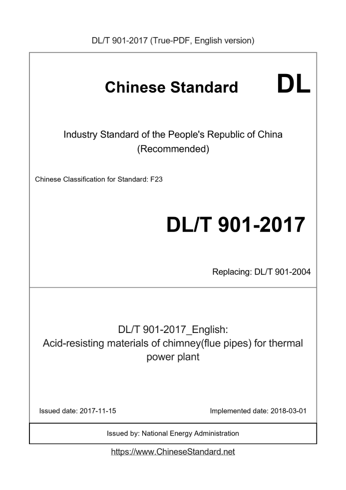 Delivery: <= 5 days. True-PDF full-copy in English will be manually translated and delivered via email. DL/T 901-2017: Acid-resisting materials of chimney(flue pipes) for thermal power plant Status: Valid DL/T 901: Historical versions