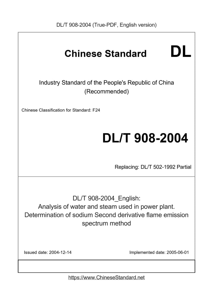 Delivery: <= 3 days. True-PDF full-copy in English will be manually translated and delivered via email. DL/T 908-2004: Analysis of water and steam used in power plant. Determination of sodium Second derivative flame emission spectrum method Status: Valid