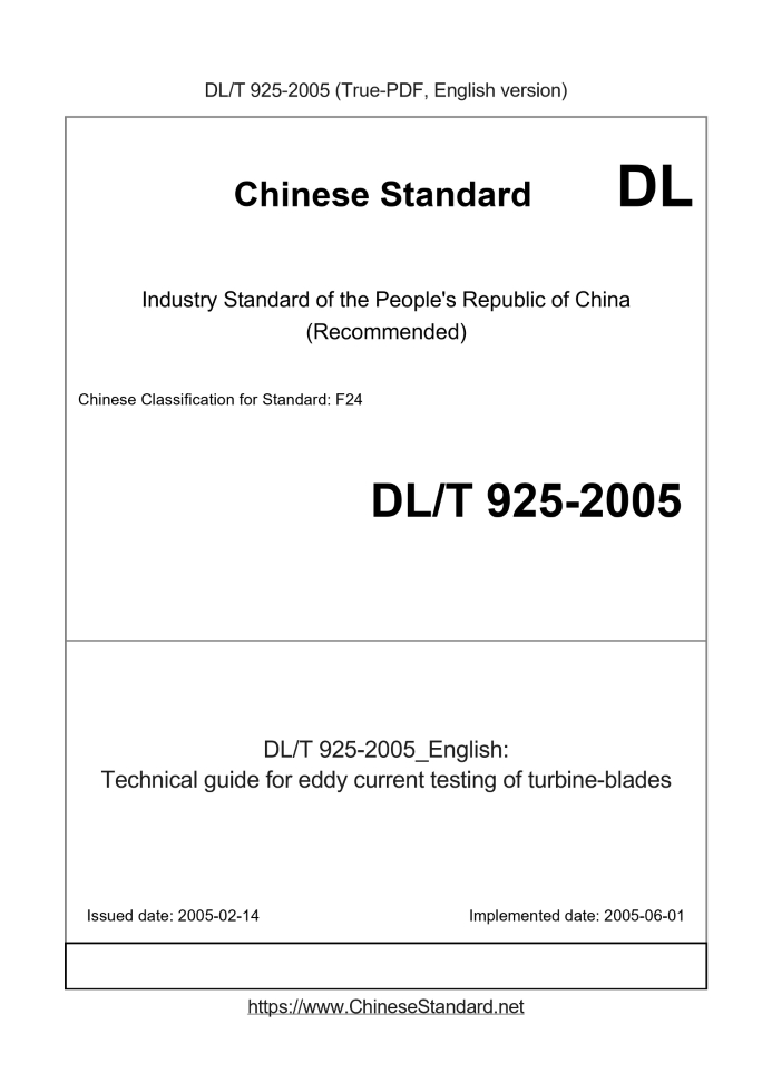 Delivery: <= 3 days. True-PDF full-copy in English will be manually translated and delivered via email. DL/T 925-2005: Technical guide for eddy current testing of turbine-blades Status: Valid