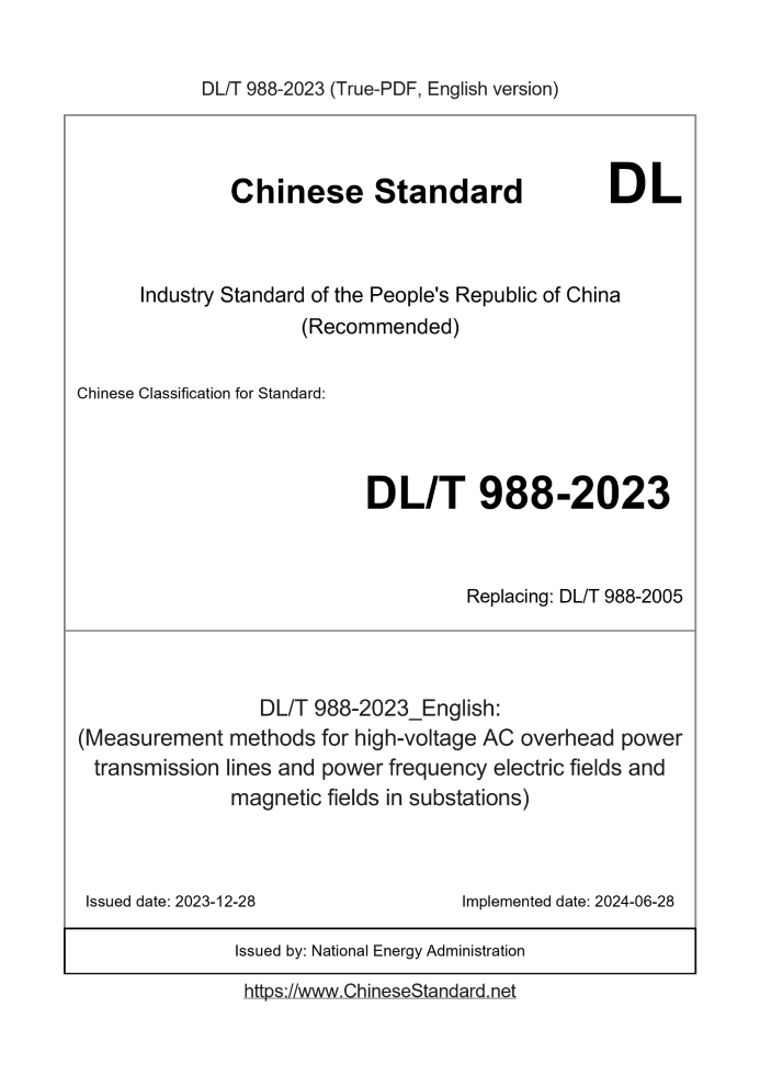 Delivery: <= 3 days. True-PDF full-copy in English will be manually translated and delivered via email. DL/T 988-2023: (Measurement methods for high-voltage AC overhead power transmission lines and power frequency electric fields and magnetic fields in substations) Status: Valid DL/T 988: Historical versions