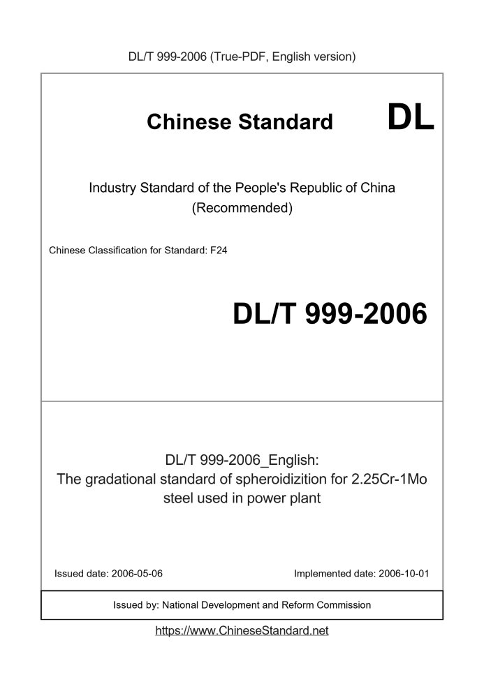 Delivery: <= 3 days. True-PDF full-copy in English will be manually translated and delivered via email. DL/T 999-2006: The gradational standard of spheroidizition for 2.25Cr-1Mo steel used in power plant Status: Valid