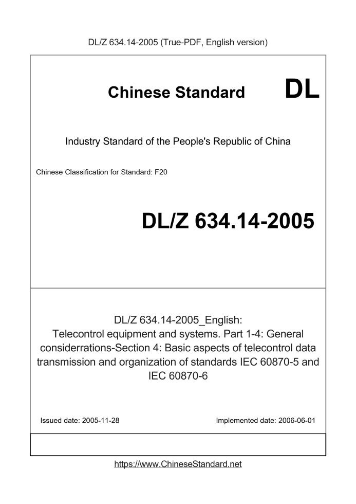 Delivery: <= 4 days. True-PDF full-copy in English will be manually translated and delivered via email. DLZ634.14-2005: Telecontrol equipment and systems. Part 1-4: General considerrations-Section 4: Basic aspects of telecontrol data transmission and organization of standards IEC 60870-5 and IEC 60870-6 Status: Valid