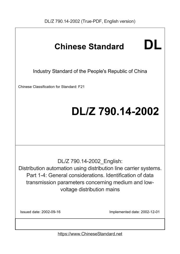 Delivery: <= 3 days. True-PDF full-copy in English will be manually translated and delivered via email. DLZ790.14-2002: Distribution automation using distribution line carrier systems. Part 1-4: General considerations. Identification of data transmission parameters concerning medium and low-voltage distribution mains Status: Valid