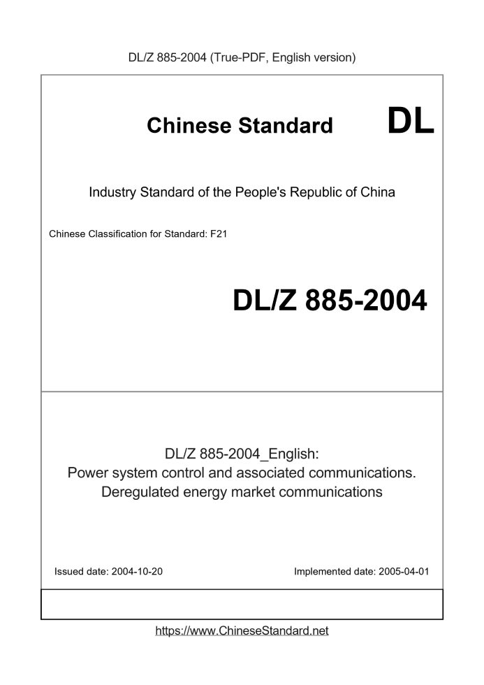 Delivery: <= 4 days. True-PDF full-copy in English will be manually translated and delivered via email. DLZ885-2004: Power system control and associated communications. Deregulated energy market communications Status: Valid