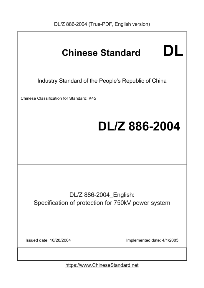 Delivery: <= 4 days. True-PDF full-copy in English will be manually translated and delivered via email. DLZ886-2004: Specification of protection for 750kV power system Status: Obsolete