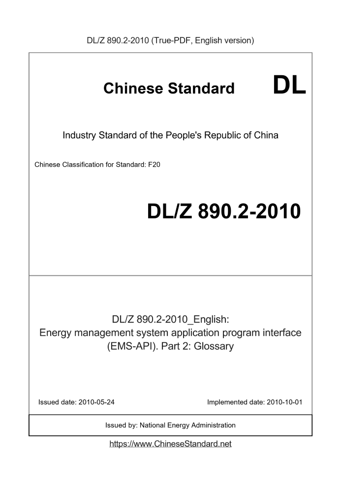 Delivery: <= 3 days. True-PDF full-copy in English will be manually translated and delivered via email. DLZ890.2-2010: Energy management system application program interface (EMS-API). Part 2: Glossary Status: Valid