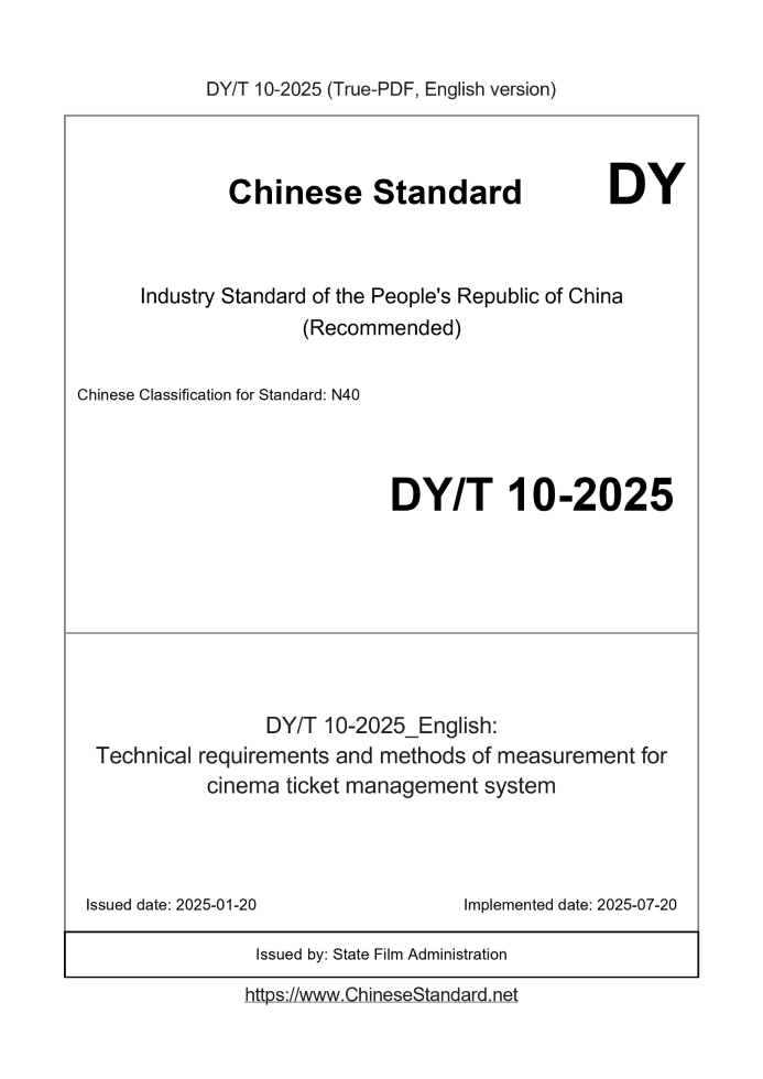 Delivery: <= 10 days. True-PDF full-copy in English will be manually translated and delivered via email. DYT10-2025: Technical requirements and methods of measurement for cinema ticket management system Status: Valid