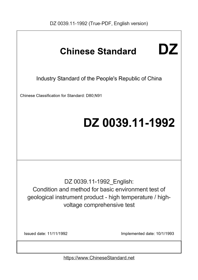 Delivery: <= 2 days. True-PDF full-copy in English will be manually translated and delivered via email. DZ 0039.11-1992: Condition and method for basic environment test of geological instrument product - high temperature / high-voltage comprehensive test