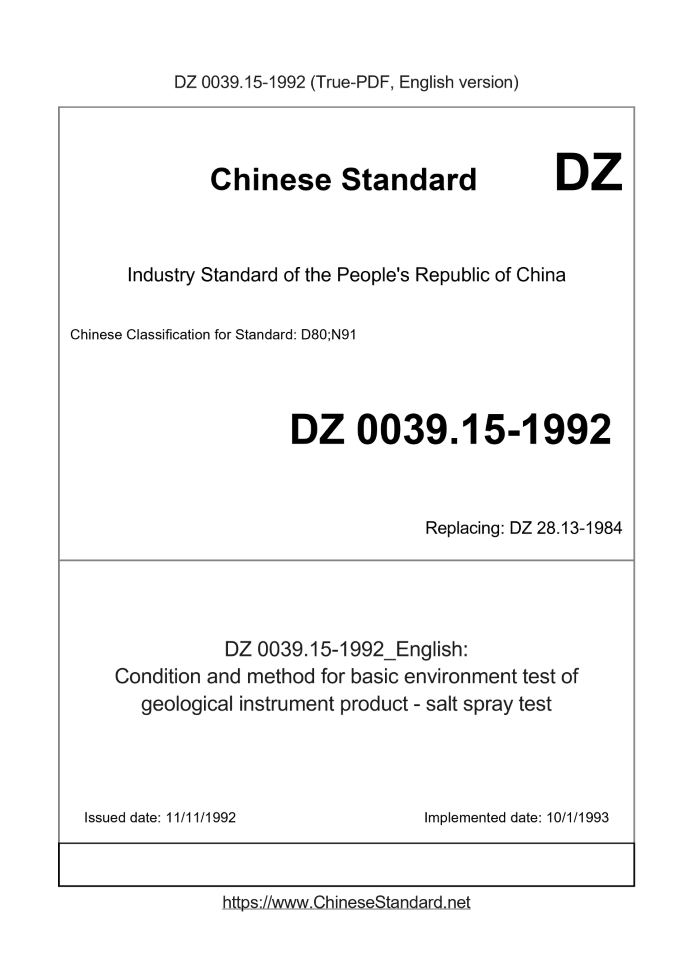 Delivery: <= 2 days. True-PDF full-copy in English will be manually translated and delivered via email. DZ 0039.15-1992: Condition and method for basic environment test of geological instrument product - salt spray test