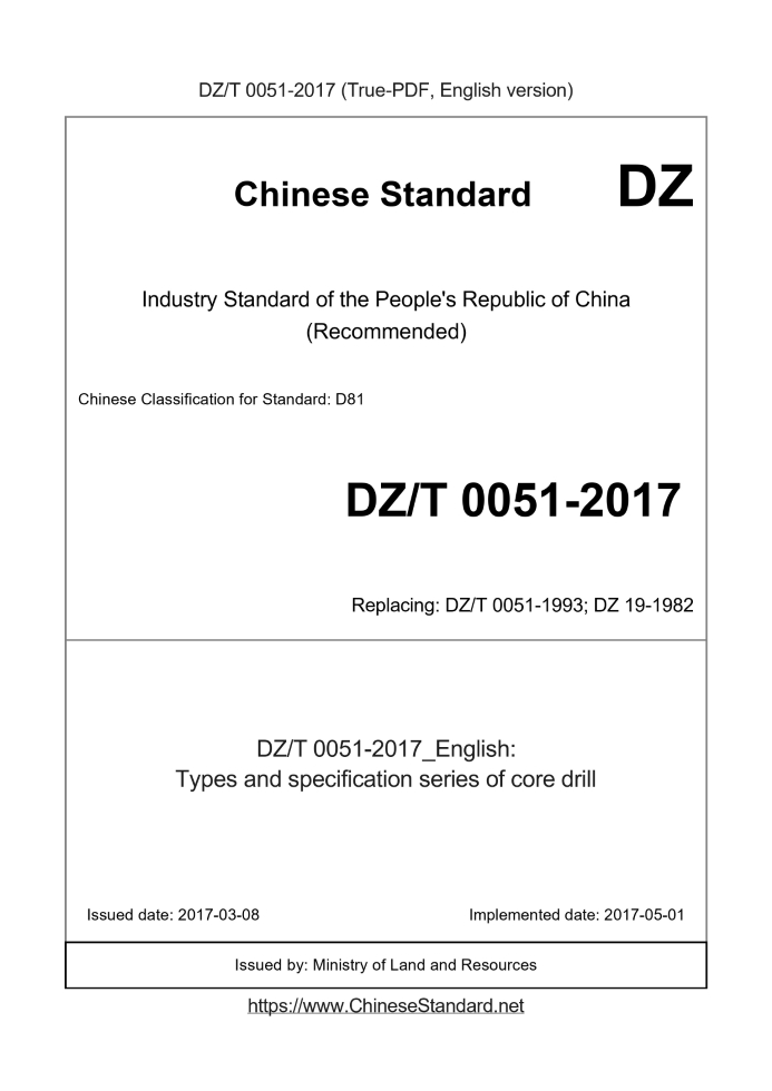 Delivery: <= 3 days. True-PDF full-copy in English will be manually translated and delivered via email. DZ/T 0051-2017: Types and specification series of core drill Status: Valid DZ/T 0051: Historical versions