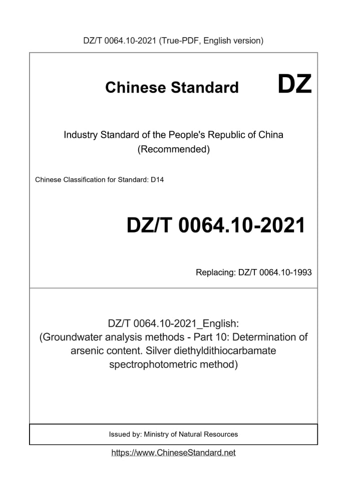 Delivery: <= 3 days. True-PDF full-copy in English will be manually translated and delivered via email. DZ/T 0064.10-2021: (Groundwater analysis methods - Part 10: Determination of arsenic content. Silver diethyldithiocarbamate spectrophotometric method) Status: Valid DZ/T 0064.10: Historical versions