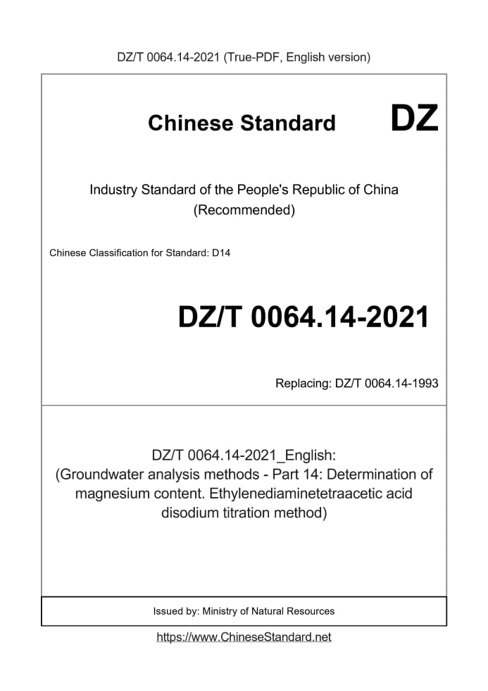 Delivery: <= 3 days. True-PDF full-copy in English will be manually translated and delivered via email. DZ/T 0064.14-2021: (Groundwater analysis methods - Part 14: Determination of magnesium content. Ethylenediaminetetraacetic acid disodium titration method) Status: Valid DZ/T 0064.14: Historical versions
