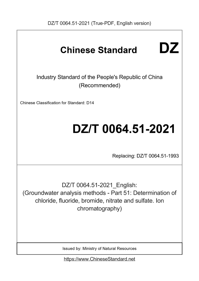 Delivery: <= 3 days. True-PDF full-copy in English will be manually translated and delivered via email. DZ/T 0064.51-2021: (Groundwater analysis methods - Part 51: Determination of chloride, fluoride, bromide, nitrate and sulfate. Ion chromatography) Status: Valid DZ/T 0064.51: Historical versions