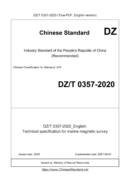 Delivery: <= 4 days. True-PDF full-copy in English will be manually translated and delivered via email. DZ/T 0357-2020: Technical specification for marine magnetic survey Status: Valid