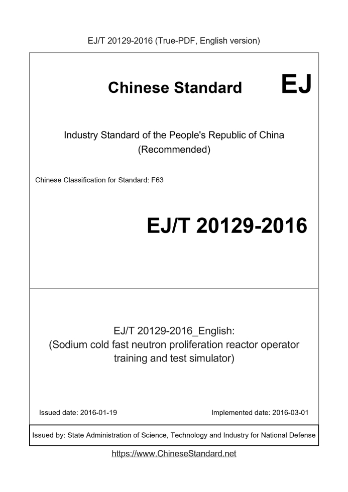 Delivery: <= 4 days. True-PDF full-copy in English will be manually translated and delivered via email. EJ/T 20129-2016: (Sodium cold fast neutron proliferation reactor operator training and test simulator) Status: Valid