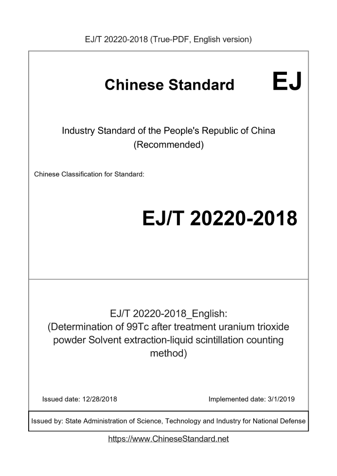 | EJ/T 20220-2018 | English | RFQ | ASK | 3 days [Need to translate] | (Determination of 99Tc after treatment uranium trioxide powder Solvent extraction-liquid scintillation counting method) |