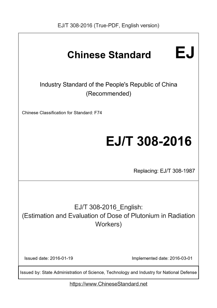 Delivery: <= 5 days. True-PDF full-copy in English will be manually translated and delivered via email. EJ/T 308-2016: (Estimation and Evaluation of Dose of Plutonium in Radiation Workers) Status: Valid