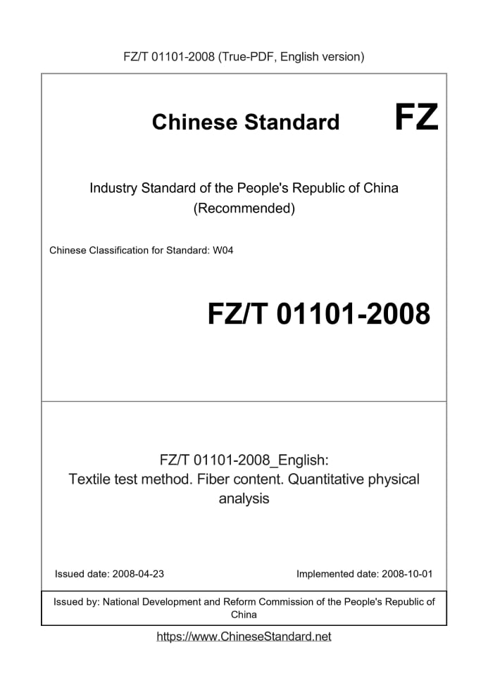 Delivery: <= 3 days. True-PDF full-copy in English will be manually translated and delivered via email. FZ/T 01101-2008: Textile test method. Fiber content. Quantitative physical analysis Status: Valid