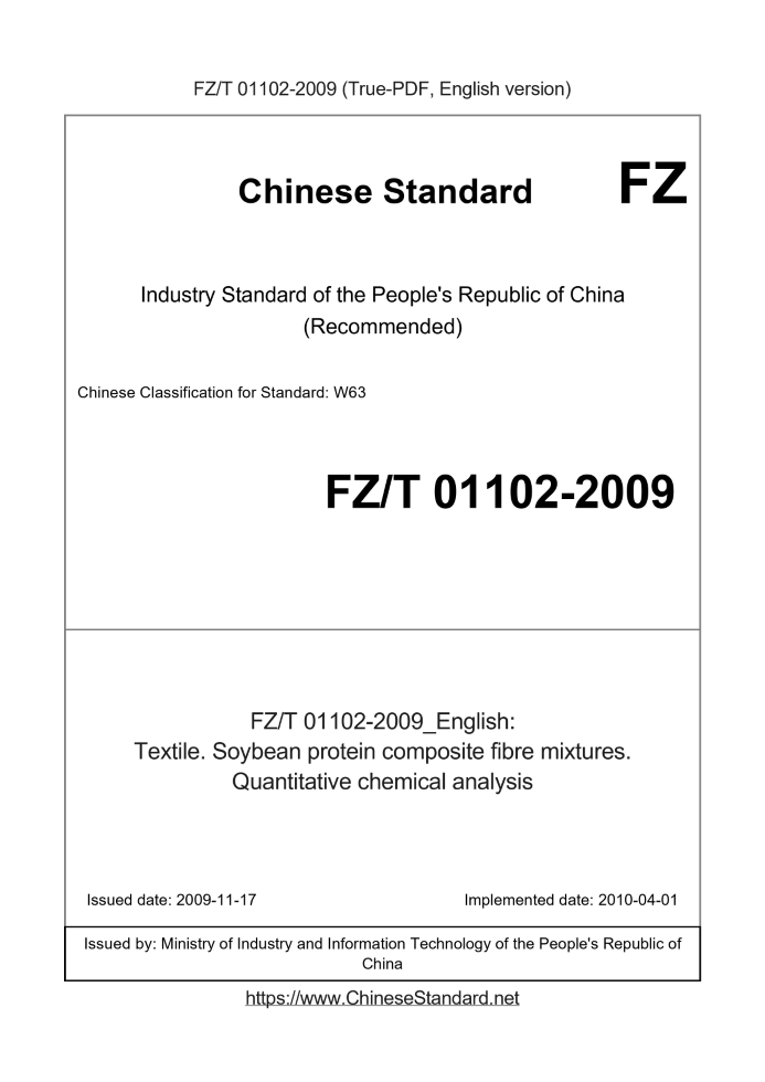 Basic dataStandard ID: FZ/T 01102-2009 (FZ/T01102-2009)Description (Translated English): Textile. Soybean protein composite fibre mixtures. Quantitative chemical analysis Sector / Industry: Spinning & Textile Industry Standard (Recommended) Classification of Chinese Standard: W63 Classification of International Standard: 59.080.30 Word Count Estimation: 9,998 Date of Issue: 2009-11-17 Date of Implementation: 2010-04-01 Quoted Standard: GB/T 2910.1 Regulation (derived from): Engineering [ 2009 ] No. 63 Issuing agency(ies): Ministry of Industry and Information Technology of the People's Republic of China Summary: This standard specifies the soybean protein fiber (with polyvinyl alcohol) two -component mixture of chemical analysis. This standard applies to soybean protein fiber (with polyvinyl alcohol) and certain other fibers of the two -component mixtures. FZ/T 01102-2009: Textile. Soybean protein composite fibre mixtures. Quantitative chemical analysis---This is a DRAFT version for illustration, not a final translation. Full copy of true-PDF in English version (including equations, symbols, images, flow-chart, tables, and figures etc.) will be manually/carefully translated upon your order. Textile. Soybean protein composite fibre mixtures. Quantitative chemical analysis ICS 59.080.30 W63 People's Republic of China textile industry standards Soybean protein fiber blended textile products Quantitative chemical analysis Posted 2009-11-17 2010-04-01 implementation Ministry of Industry and Information Technology of the People's Republic of China released ForewordThe standard proposed by China Textile Industry Association. This standard by the National Standardization Technical Committee Textile Wool Textile Technical Committee (SAC/TC209/SC3) centralized. This standard was drafted. Shanghai Textile Science and Technology Institute of wool and linen. The main drafters of this standard. Chen Meihua, Yan Yan screen, Chen Jie, Zhu Qingfang, Li Zhihua, Ping Gong. Soybean protein fiber blended textile products Quantitative chemical analysis1 ScopeThis standard specifies the chemical analysis of soybean protein fiber (with a polyvinyl compound) two-component mixture. This standard applies to soybean protein fiber (with a polyvinyl compound) two component mixtures with certain other fibers.2 Normative referencesThe following documents contain provisions which, through reference in this standard and become the standard terms. For dated references, subsequent Amendments (not including errata content) or revisions do not apply to this standard, however, encourage the parties to the agreement are based on research Whether the latest versions of these documents. For undated reference documents, the latest versions apply to this standard. GB/T 2910.1 Textiles - Quantitative chemical analysis - Part 1. General principles of testing (GB/T 2910.1-2009, ISO 1833-1. 2006, IDT) 3 soybean protein fiber and cotton, viscose, modal fibers, polyacrylonitrile fibers or two-component mixture of polyester fibers (hypochlorous acid Sodium/hydrochloric acid method) 3.1 Principle Sodium hypochlorite solution with 1mol L/soybean protein fiber in the soy protein is dissolved and removed from a known dry mass of the specimen, With 20% hydrochloric acid solution and then the protein fiber remaining portion (polyvinyl formal) dissolved and removed, the residue was collected, cleared Washing, drying and weighing, calculating its share of the dry mass of the mixture with a percentage of mass amended. Obtained by the difference of soybean protein fiber The percentage of quality. 3.2 Reagents Use GB/T 2910.1 and 3.2.1,3.2.2,3.2.3,3.2.4 provisions reagents. Sodium hydroxide was added sodium hypochlorite solution 1mol/L in that its content of 5g/L. This solution can be iodometric titration so that its concentration Degree in 0.9mol/L ~ 1.1mol/L. 3.2.2 hydrochloric acid solution (20% mass fraction) Take 1000mL concentrated hydrochloric acid (20 deg.] C when density of 1.19g/mL) was slowly added to 800mL water, cooling to 20 ℃, plus Water, amend its density 1.095g/mL ~ 1.100g/mL. Concentration at 19.5% ~ 20.5%. 3.2.3 in dilute acetic acid Take 5mL glacial acetic acid diluted with water to 1000mL. 3.2.4 dilute aqueous ammonia solution Take 80mL of concentrated aqueous ammonia (density 0.880g/mL), diluted with water to 1000mL. 3.3 Device Use GB/T 2910.1 and 3.3.1,3.3.2 specified device. 3.3.1 stoppered Erlenmeyer flask with a capacity of 250mL. 3.3.2 water bath, maintaining the temperature at 20 ℃ ± 2 ℃. 3.4 Test procedure According to GB/T 2910.1 prescribed generic procedure, and then follow the steps below. The prepared sample into an Erlenmeyer flask, 100mL per gram of sample was added sodium hypochlorite solution (3.2.1) in a water bath (3.3.2) on ......Tips & Frequently Asked Questions:Question 1: How long will the true-PDF of FZ/T 01102-2009_English be delivered?Answer: Upon your order, we will start to translate FZ/T 01102-2009_English as soon as possible, and keep you informed of the progress. The lead time is typically in 9 seconds (download/delivered in 9 seconds). The lengthier the document the longer the lead time.Question 2: Can I share the purchased PDF of FZ/T 01102-2009_English with my colleagues?Answer: Yes. The purchased PDF of FZ/T 01102-2009_English will be deemed to be sold to your employer/organization who actually pays for it, including your colleagues and your employer's intranet.Question 3: Does the price include tax/VAT?Answer: Yes. Our tax invoice, downloaded/delivered in 9 seconds, includes all tax/VAT and complies with 100+ countries' tax regulations (tax exempted in 100+ countries) -- See Avoidance of Double Taxation Agreements (DTAs): List of DTAs signed between Singapore and 100+ countriesQuestion 4: Do you accept my currency other than USD?Answer: Yes. If you need your currency to be printed on the invoice, please write an email to Sales@ChineseStandard.net. In 2 working-hours, we will create a spe