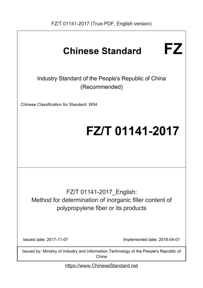 Delivery: <= 3 days. True-PDF full-copy in English will be manually translated and delivered via email. FZ/T 01141-2017: Method for determination of inorganic filler content of polypropylene fiber or its products Status: Valid