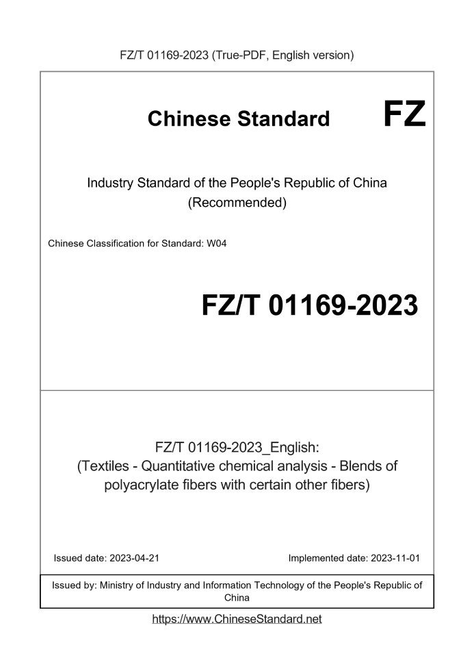 Delivery: <= 3 days. True-PDF full-copy in English will be manually translated and delivered via email. FZ/T 01169-2023: (Textiles - Quantitative chemical analysis - Blends of polyacrylate fibers with certain other fibers) Status: Valid