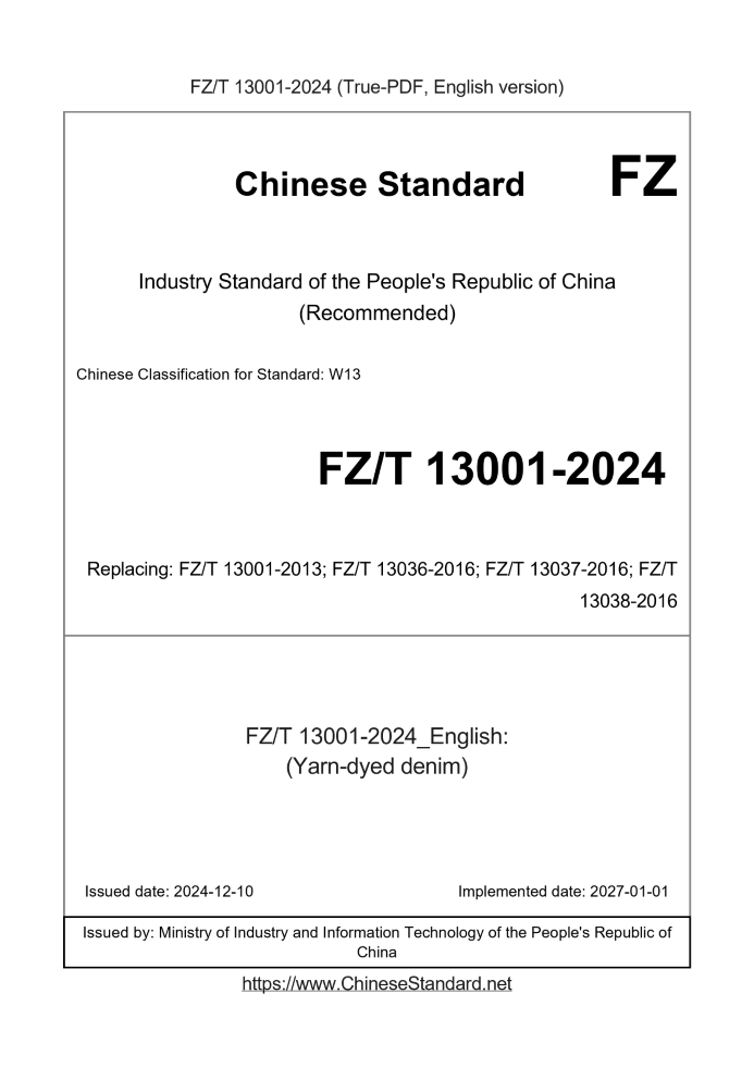 Delivery: <= 4 days. True-PDF full-copy in English will be manually translated and delivered via email. FZ/T 13001-2024: (Yarn-dyed denim) Status: Valid FZ/T 13001: Historical versions