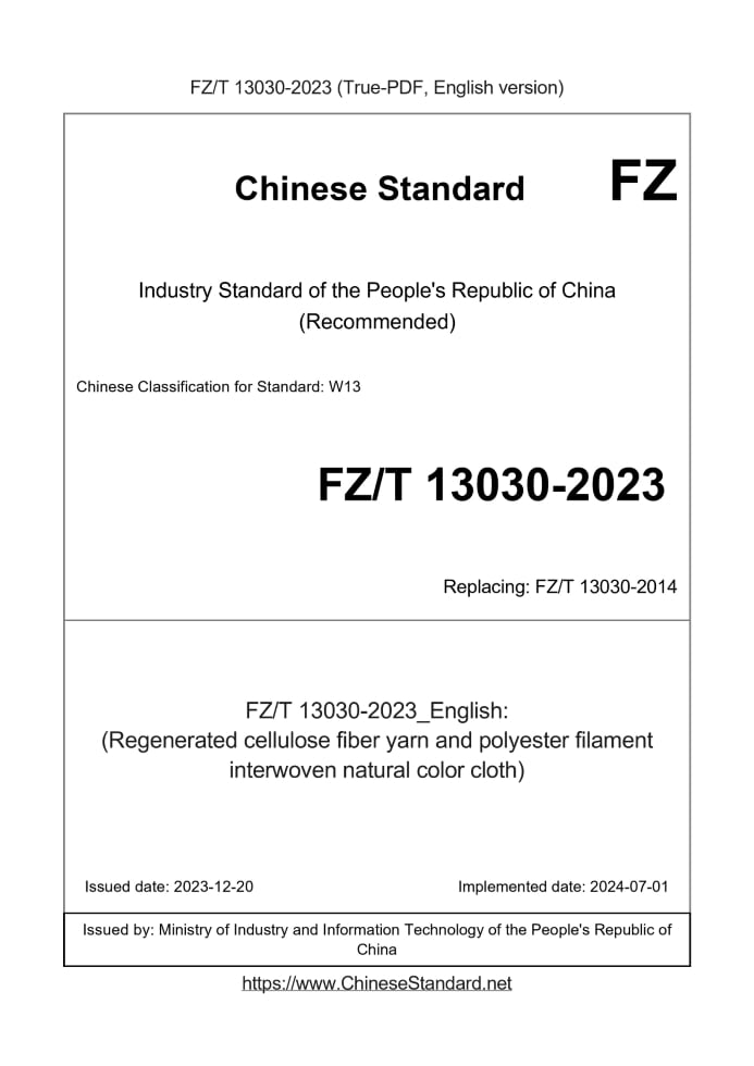 Delivery: <= 3 days. True-PDF full-copy in English will be manually translated and delivered via email. FZ/T 13030-2023: (Regenerated cellulose fiber yarn and polyester filament interwoven natural color cloth) Status: Valid FZ/T 13030: Historical versions