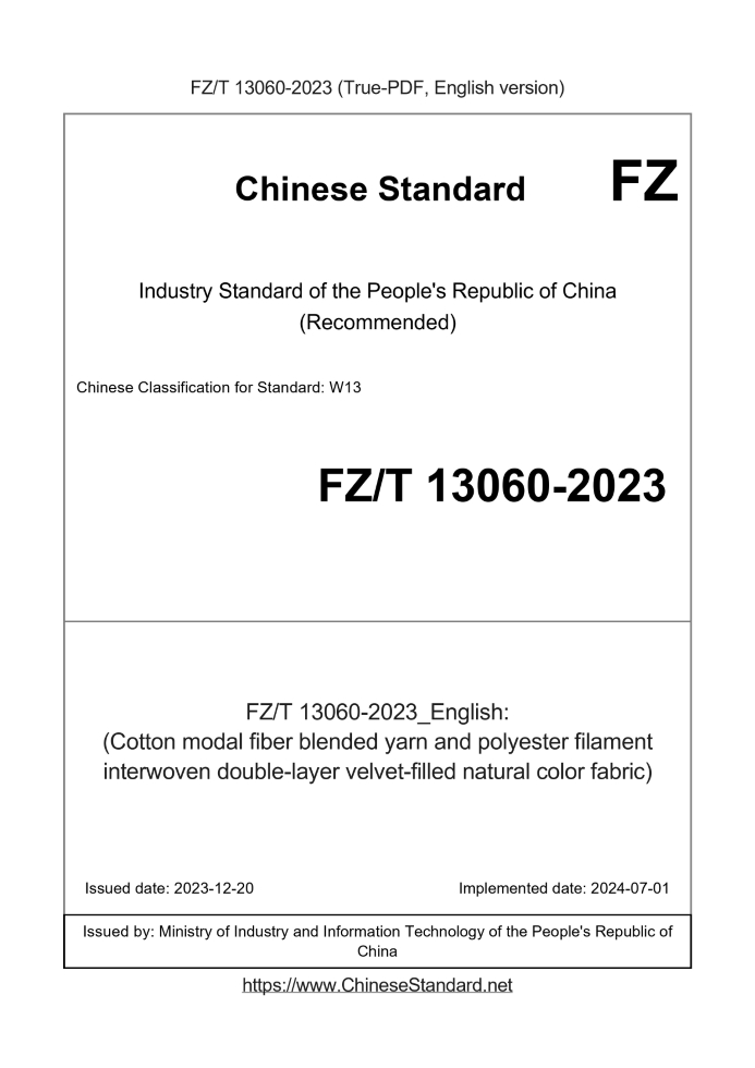 Delivery: <= 3 days. True-PDF full-copy in English will be manually translated and delivered via email. FZ/T 13060-2023: (Cotton modal fiber blended yarn and polyester filament interwoven double-layer velvet-filled natural color fabric) Status: Valid