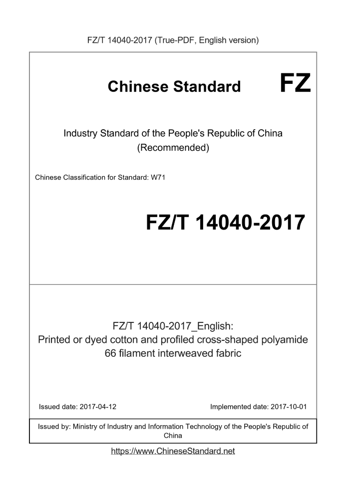 Delivery: <= 3 days. True-PDF full-copy in English will be manually translated and delivered via email. FZ/T 14040-2017: Printed or dyed cotton and profiled cross-shaped polyamide 66 filament interweaved fabric Status: Valid
