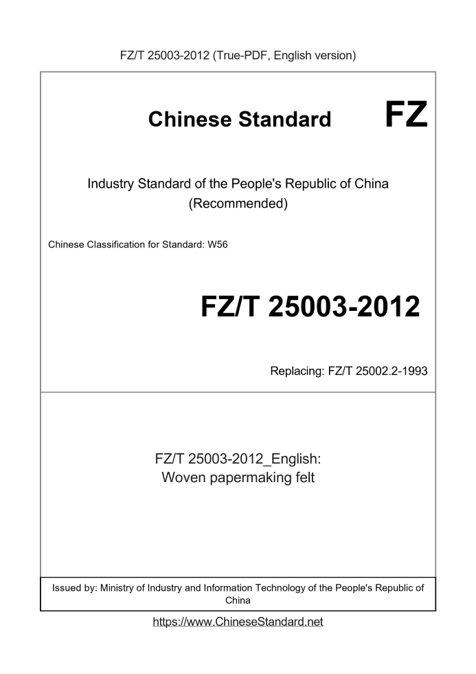 Delivery: <= 3 days. True-PDF full-copy in English will be manually translated and delivered via email. FZ/T 25003-2012: Woven papermaking felt Status: Valid