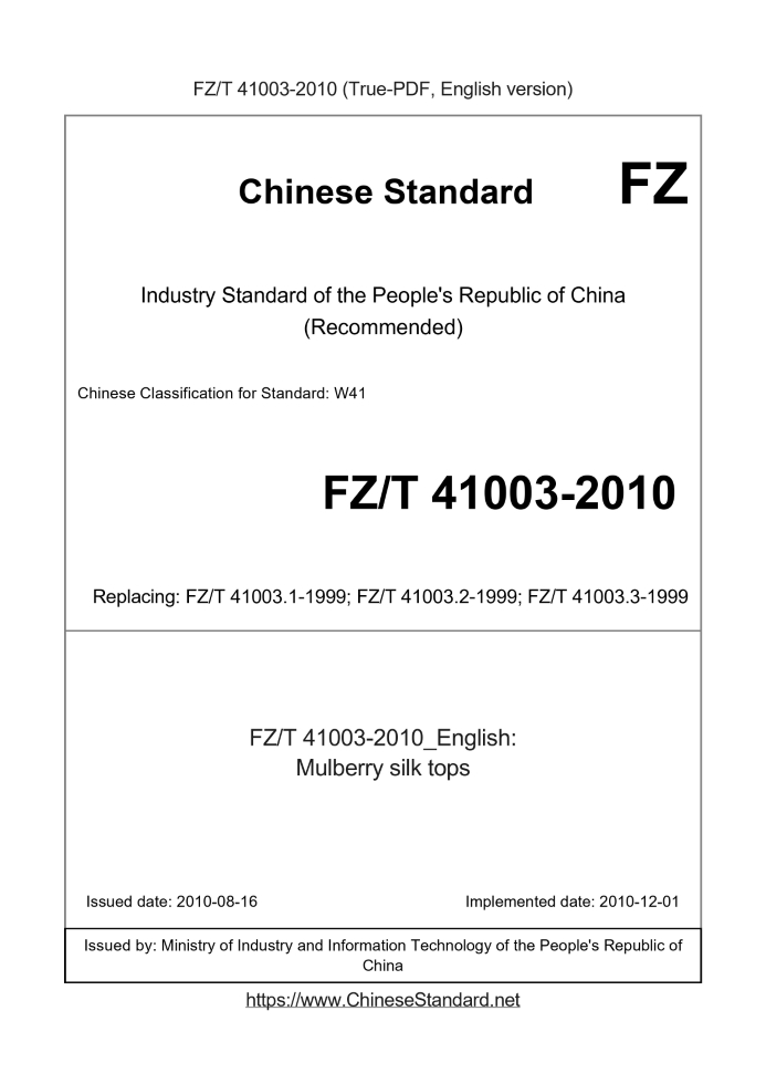 Delivery: <= 3 days. True-PDF full-copy in English will be manually translated and delivered via email. FZ/T 41003-2010: Mulberry silk tops Status: Valid FZ/T 41003: Historical versions