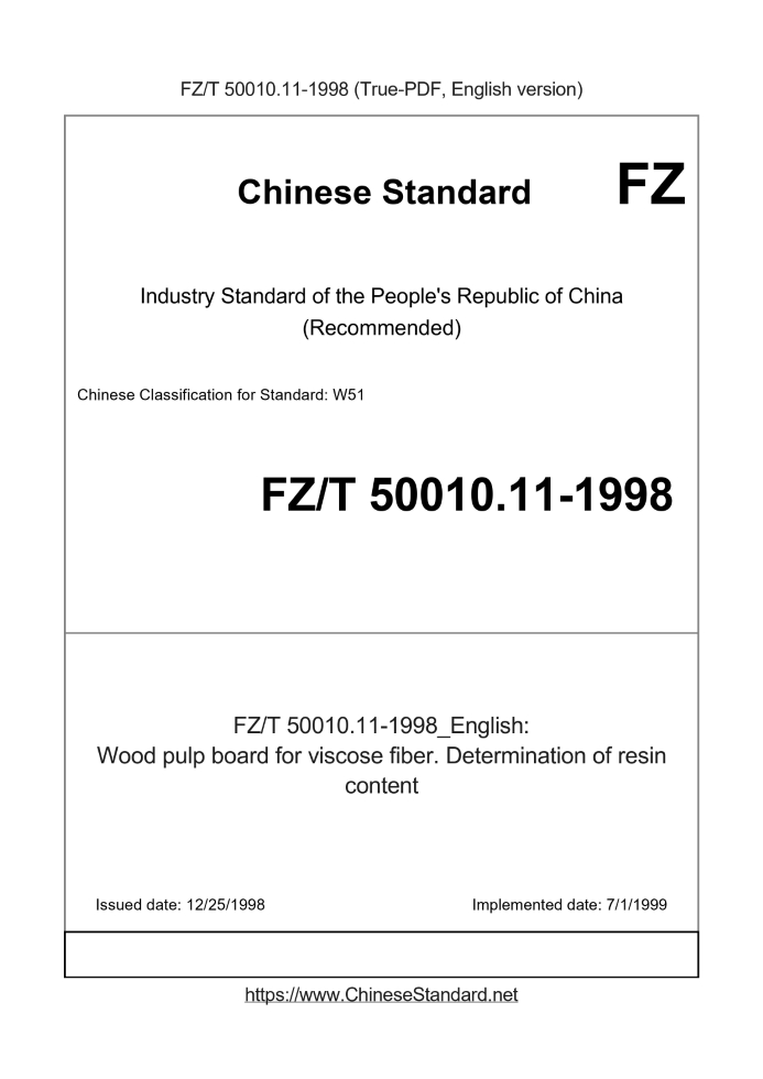 Delivery: <= 2 days. True-PDF full-copy in English will be manually translated and delivered via email. FZ/T 50010.11-1998: Wood pulp board for viscose fiber. Determination of resin content